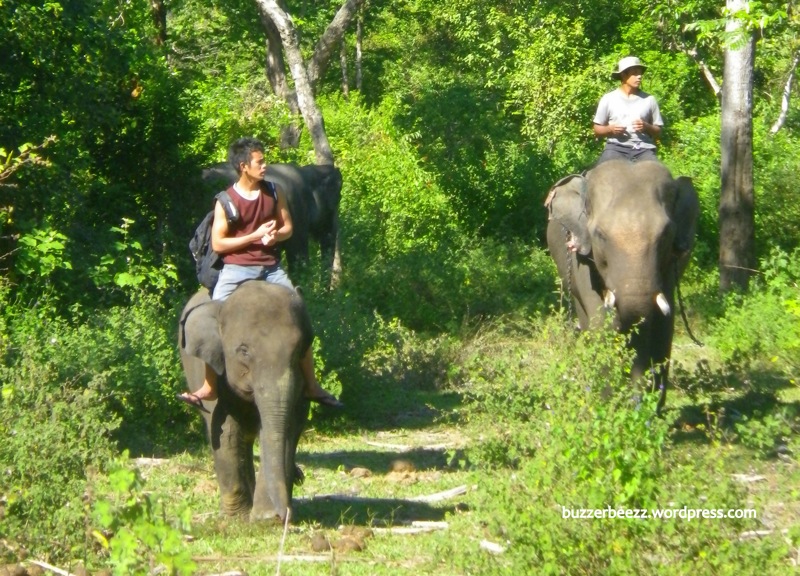 Setelah asyik ngobrol seru dengan pawang, kami ditawari untuk berkeliling area Pusat Latihan Gajah dengan naik gajah. Tanpa berpikir lama, kami terima tawaran itu. Ini pertama kali pengalaman saya naik gajah. Aneh rasanya. Tidak senyaman seperti naik kuda. Beberapa kali rasanya hampir jatuh ke tanah. Entah karena posisi duduk saya yang salah atau memang karena tidak terbiasa, benar-benar tidak nyaman rasanya. Bergoyang-goyang tiap si gajah melangkahkan kakinya. Dan ternyata setelah berkeliling, saya baru tahu kalau jumlah gajah disana lumayan banyak juga. Memang, tidak mencapai puluhan sih. Atau paling tidak cuma itu yang saya lihat. Mungkin di dalam hutan masih banyak lagi.