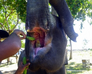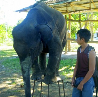Kami pun menghampiri mereka. Ternyata gajah-gajah itu baru saja dimandikan oleh para pawangnya. Dan sekarang waktu makan pagi. Karena gajah dewasa bersama pawangnya menjauh dari kami, akhirnya kami bermain-main dengan si gajah kecil (bukan Bona namanya! :p). Amoy, itu nama si gajah kecil ini. Amoy yang berumur 3 tahun itu sudah sangat jinak. Tak lama, selain kami, ada juga pengunjung lain. Seorang ayah bersama seorang gadis kecilnya. Melihat Amoy yang terlatih itu beratraksi mengikuti perintah pawangnya, si gadis kecil itu tertawa. Tapi ketika si gadis kecil didekatkan ke Amoy, sontak gadis kecil itu menjerit takut. Tampaknya gadis kecil itu ketakutan berdekatan dengan Amoy. Pertunjukan kecil standar yang dilakukan oleh Amoy dan sang pawang cukup menghibur kami. Atraksinya antara lain duduk, naik ke kursi, dan makan pisang. Bahkan saya pun ikut memberi makan Amoy.