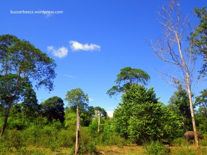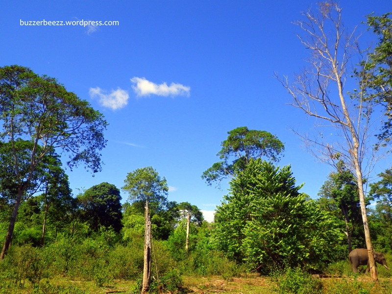 Relatif masih pagi kami sampai disana. Tanpa plang ataupun tulisan lain yang menunjukkan bahwa disitu lah Pusat Latihan Gajah berada, kami nekat masuk melalui sebuah gapura. Sampai di dalam pun masih belum yakin juga, apakah benar ini tempatnya. Sepi. Jangankan gajah, orang saja tidak ada. Hanya sebuah pondok kecil yang bertuliskan sesuatu tentang perawatan gajah (saya lupa apa bunyi tepatnya tulisan itu), sebuah kubangan air, dan sebuah lahan lapang berumput yang cukup luas dikelilingi dengan pepohonan dan semak belukar yang saya temukan disana. Saya memperhatikan sekeliling. Dan ternyata di kejauhan, dekat dengan pepohonan, saya melihat sesosok gajah besar dengan gading cukup panjang sedang asyik menikmati rerumputan dan dedaunan sebagai sarapan paginya. Saya ragu untuk mendekat. Tidak tahu bahaya atau tidak kalau saya dekati. Tak lama, dari balik pepohonan yang ternyata adalah hutan yang cukup lebat, ada 2 ekor gajah, 1 gajah dewasa dan 1 gajah kecil, keluar menuju tempat saya berdiri. Kedua gajah itu tak sendiri. Ada 2 orang yang duduk di punggungnya. Oh, ini mungkin para pelatih atau pawang gajah yang bekerja disini.