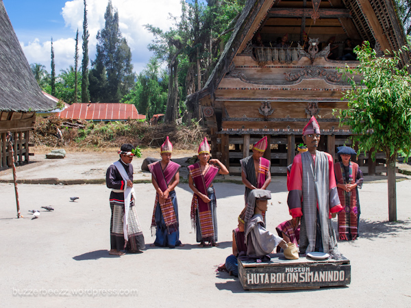Sekarang kami berada di sebuah kampung yang bernama Huta Bolon. Huta adalah kampung tradisional Batak yang hanya memiliki satu pintu dan dikelilingi oleh Benteng dan pohon bambu untuk mencegah musuh masuk ke dalam kampung. Biasanya, dalam satu Huta dihuni oleh beberapa keluarga yang terikat dalam satu kerabat. Rumah-rumah di dalam Huta berbaris di samping kanan dan kiri Rumah Bolon, sebutan untuk rumah Raja. Di hadapan rumah Raja terdapat lumbung padi yang dinamakan Sopo. Halaman luas antara rumah Raja dan Sopo itulah dahulu dipergunakan untuk Mangalahat Horbo, yang berarti acara adat memotong kerbau dan memukul gondang. Kerbau yang akan disembelih digiring menuju Borotan, sebuah tonggak yang dihiasi dedaunan yang melambangkan pohon suci.Rangkaian upacara adat Mangalahat Horbo mulai dilakukan oleh para penari berpakaian adat Batak lengkap dengan ulos yang tersampir di bahu. Nyanyian berbahasa Batak dengan sesekali teriakan “Horas!” bersinergi dengan alunan musik. Upacara ini ada 12 babak, diawali dari Gondang Lae-lae sampai Gondang Sigale-gale dipamerkan kepada pengunjung . Itulah setting pertunjukan tarian tradisional Batak dari Museum Huta Bolon Simanindo yang kami saksikan.