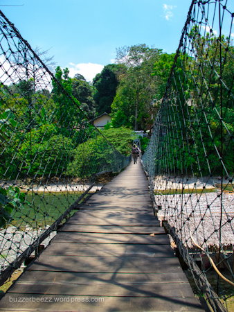 Sekitar 3 jam perjalanan yang dihabiskan oleh sebagian besar peserta dengan tidur, sampailah kami di Bukit Lawang. Langsung menuju tempat nginap kami, Ecolodge. Terletak di pinggir sungai Bahorok yang berarus cukup deras, memaksa kami harus melewati jembatan gantung yang cukup pajang untuk menuju Ecolodge. Dan dari semua peserta Jejak Kaki, gak ada yang ngalahin ramenya teriakan Fifi saat menyeberang. Jembatan gantung yang bergoyang ketika disusuri sepertinya membuat Fifi phobia. Sebelum menuju Orangutan Feeding Center, kami menikmati sajian makan siang dari Ecolodge dilanjutkan dengan pembagian kamar. Saya berbagi kamar dengan Sule, yang ternyata sudah sering ikut trip Jejak Kaki sehingga nampak sangat akrab dengan banyak orang. Saya dan Sule menempati kamar Siamang Lodge. Setelah berganti pakaian yang aman digunakan untuk basah-basahan, kami menuju ke Orangutan Feeding Center (cerita selengkapnya bisa dibaca di sini) yang dilanjutkan dengan tube rafting menyusuri Sungai Bahorok. Saya, Sule, dan Mbak Ellis berada dalam 1 tim tube rafting. Tube rafting di Sungai bahorok ini adalah aktifitas rafting menggunakan ban besar menyusuri aliran sungai yang berbatu. 5 buah ban dirangkai menjadi 1 diisi oleh navigator di ban paling depan dan belakang, sedangkan kami bertiga berada di tengah. Cukup mengasyikkan bagi saya, walaupun kurang terasa menantang.