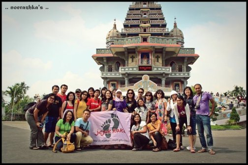 Ternyata perjalanan Pematangsiantar menuju Medan lumayan lama juga. Sekitar 2 jam kemudian kami baru sampe Medan. Pemberhentian pertama di Rumah Makan ACC di Jalan Sisingamangaraja untuk makan siang. Usai makan siang, dilanjutkan dengan city tour menuju ke gereja Annai Velangkani. Walaupun sering main ke Medan, namun baru kali ini saya mengunjungi gereja yang berada di Jalan Sakura III No. 10, Tanjung Selamat Medan ini. Gereja dengan arsitektur unik perpaduan dari India dan Mogul ini membentuk bangunan seperti candi dengan kubah-kubah serupa masjid menghiasi atap. Walaupun berfungsi sebagai tempat ibadah umat Katholik, namun gereja ini juga membuka pintu lebar-lebar kepada umat agama lain untuk berkunjung. Saya pun cukup menikmati wisata religi di gereja ini. Bagi saya, semakin mengenal tentang agama lain semakin besar pula rasa toleransi yang tumbuh dalam diri saya. Tidak lupa, sebelum meninggalkan gereja ini, foto khas Jejak Kaki dengan spanduk warna ungunya harus dilakukan.