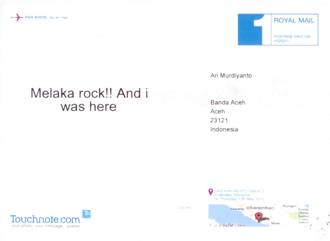Berawal dari iseng menggunakan aplikasi Touchnote, terbesit ide untuk mengirim kartu pos via Touchnote ketika saya traveling ke Malaka beberapa waktu lalu. Karena gak mau rugi, kartu posnya bergambar foto saya sedang mejeng dekat Queen Victoria Fountain dan saya kirimkan ke alamat saya sendiri. Haha.. It was fun.