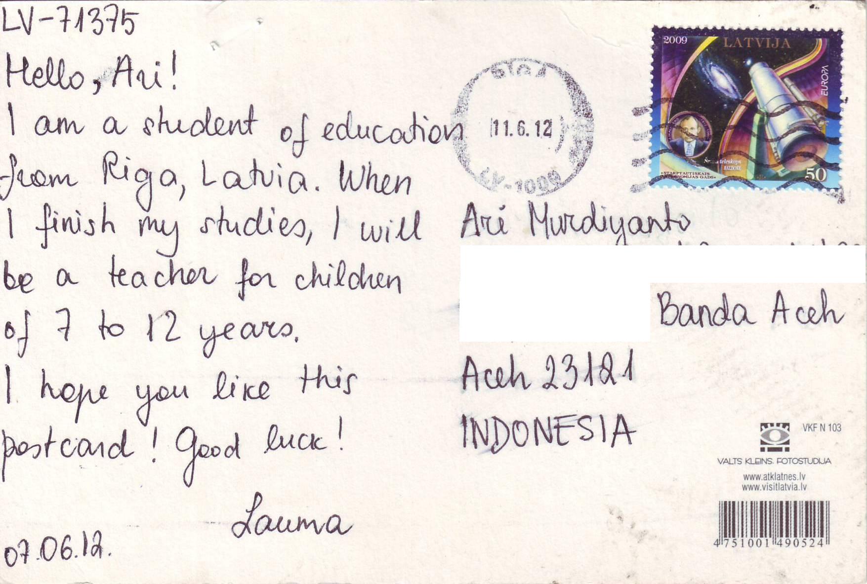 This is my first postcard from Latvia. It’s always nice receiving a card from some country for the first time. I don’t know what happened with this card, but it’s a little bit stained. 41 days journey from Latvia to Indonesia, no wonder it got a little bit stained. Thanks Lauma for sending me this card 🙂