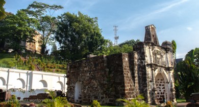 Melihat papan petunjuk di sekitar St Paul Church, kami mengikuti arah panah ke Dutch Graveyard dengan penuh rasa penasaran. Terletak di belakang bukit St. Paul Church berdiri, areal pemakaman Belanda ini ternyata tidak begitu besar. Selain orang Belanda, beberapa tentara Inggris juga dikuburkan di sini. Perjalanan kami berlanjut menyusuri jalan di samping kompleks kuburan ini. Melewati Melaka Sultanate Palace, kami langsung menuju A Famosa. Bangunan yang juga merupakan ikon kota Melaka ini adalah sebuah gerbang benteng Portugis yang masih tersisa. Sama seperti bangunan bersejarah lainnya yang berada di Melaka, gerbang yang disebut juga dengan nama Porta de Santiago ini pun mengalami perpindahan tangan dari Portugis, Belanda, kemudian ke Inggris seiring dengan pendudukan bangsa kolonial yang berbeda. Dengan melihat gerbang benteng yang cukup besar ini, saya membayangkan dulu pasti kota Melaka ini dikelilingi benteng yang kokoh.