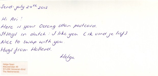 Memang, sejak saya berkunjung ke Bukit Lawang, seperti yang sudah saya ceritakan di sini, saya jatuh cinta pada makhluk oranye ini. Jadi, begitu dapat kartu pos bergambar Orangutan ini, saya senang sekali. “Ik vind je lief…”, kata si Orangutan di kartu ini. “I like you too”, spontan saya jawab dalam hati 🙂
