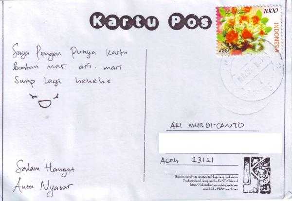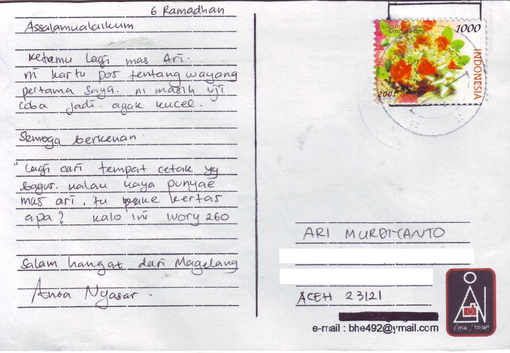 Senang deh punya teman yang kreatif. Bisa dikirim kartu pos hasil bikinan sendiri seperti di atas ini. Adalah Sugeng, seorang postcrosser asal Magelang yang mengirimi saya 2 buah kartu pos handmade bergambar wayang di atas. Ada yang tahu apa nama karakter wayang di atas? Yang pertama adalah Bathara Surya dan yang kedua adalah Bathara Indra.