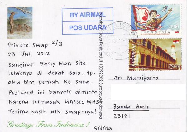 Masih dari Shinta yang mengirimi saya kartu pos Peta Indonesia. Sangiran adalah salah satu Unesco World Heritage Site yang dimiliki oleh Indonesia. Jauh sebelum menerima kartu pos ini, saya sudah sangat kepengen berkunjung ke Sangiran. Ada yang sudah pernah ke sana?