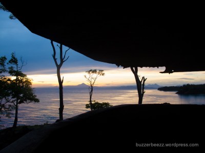 Usai memarkir motor, saya menjejak setapak menuju ke puncak bukit kecil yang di atasnya berdiri kokoh benteng peninggalan Jepang. Cukup terengah saya menuju ke atas. Serta merta saya menyesal ketika bangun pagi tadi tidak minum air putih. Dan lebih menyesal lagi karena saya juga tidak membawa air minum yang bisa meredakan dahaga. Terlihat cahaya sang surya mulai terang. Tapi tetap saja dia masih sembunyi entah di balik awan atau di balik gunung. Saya kemudian masuk ke dalam bangunan benteng. Dan terlihatlah dengan jelas sudut pandang tentara Jepang dahulu dalam memata-matai musuh di lautan. Tersembunyi di dalam benteng, saya merasakan damai dan aman.