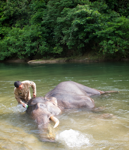 Inilah rutinitas seorang mahout di Conservation Response Unit (CRU) Sampoiniet, Aceh Jaya. Setiap pagi dan sore sang pawang gajah ini memandikan gajah yang dilatihnya. Pagi itu saya beruntung bisa menyaksikan prosesi pemandian gajah. Aziz, nama gajah di atas, tampak patuh dan sangat menikmati dimandikan oleh mahout-nya. Dan sang mahout, dengan senang hati dan ikhlas, memandikan Aziz sampai bersih. Kasih sayang mahout terhadap gajahnya memang tiada dua.
