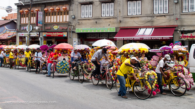 Becak wisata di kota Melaka, Malaysia, ini memang unik. Penampakannya berupa sepeda yang di samping kirinya dipasang semacam gerobak sebagai tempat duduk penumpangnya, dihiasi berbagai macam bebungaan yang meriah, serta memutar lagu-lagu upbeat gaul masa kini seperti lagunya Lady Gaga dan Katy Perry. Saking uniknya, sekelompok turis asing menyewa beberapa becak ini untuk berpawai menyusuri Jonker street.