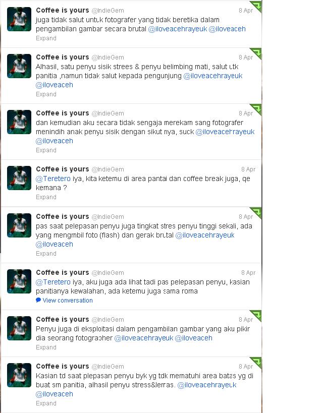 Dua malam lalu, menjelang tidur saya dikagetkan dengan sebuah twit yang berbunyi “Kasian td saat plepasan penyu byk yg tdk mematuhi area batas yg di buat sm panitia, alhasil penyu stress & lemas”. Saya teringat bahwa sore sebelumnya (8/4) di Pantai Lampuuk, Aceh, diadakan acara pelepasan tukik atau anak penyu ke laut lepas. Karena diadakan di hari kerja, saya yang sebenarnya ingin hadir pun urung. Membaca sebuah twit tadi membuat rasa penasaran saya terbit yang akhirnya berujung pada melihat timeline si empunya twit, @IndieGem. Berikut ini hasil intipan saya (bacanya dari bawah ke atas):