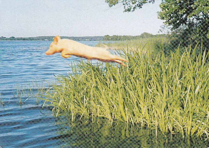 hahaha…babinya sih sebenarnya pengen mandi ketika liat danau, udh lama dia gak mandi. Tapi yang membuat saya heran kenapa kartu pos ini memuat gambr babi yang loncat ke air.