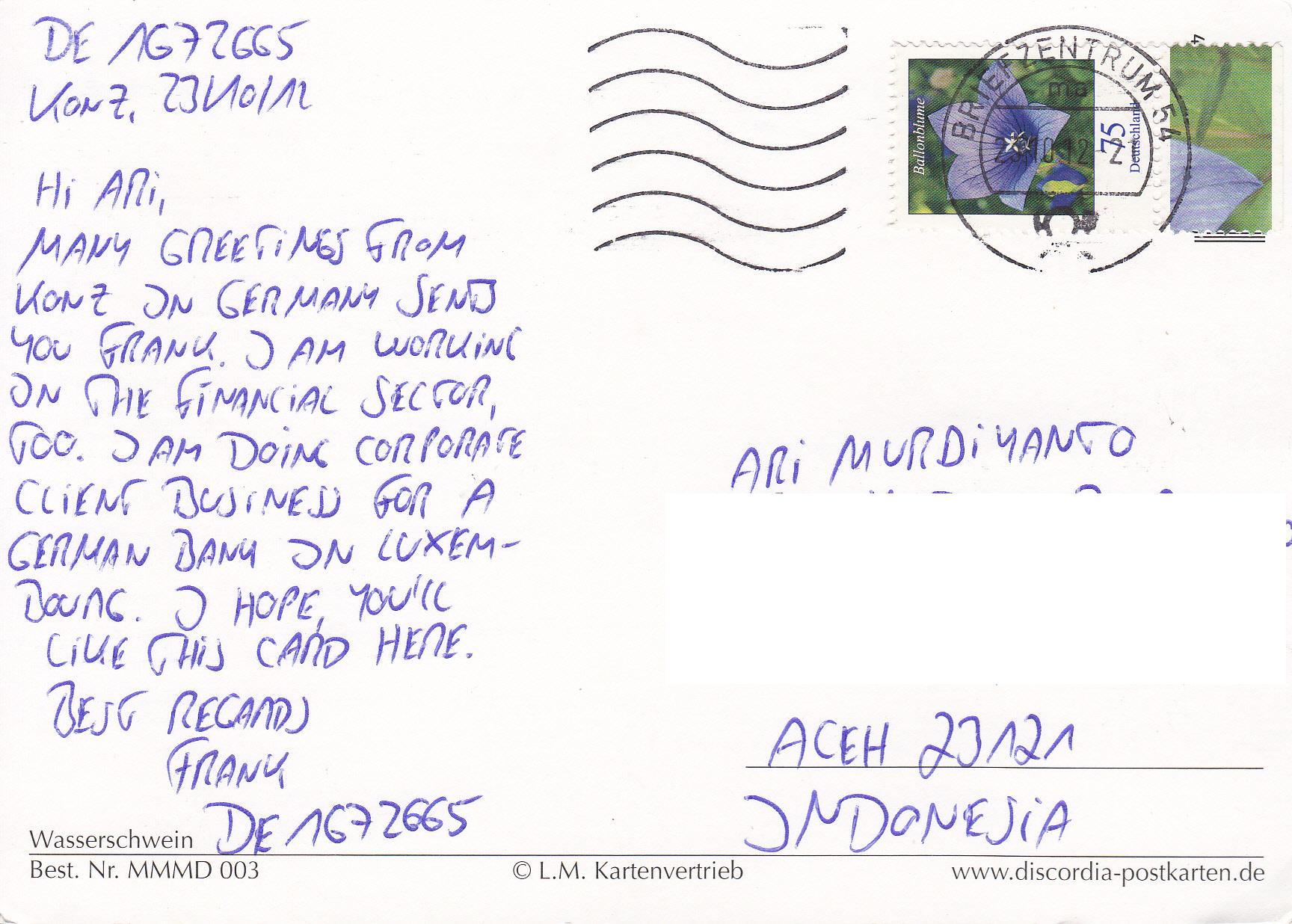 Kartu pos yang sudah saya terima lama dari Frank di Jerman ini saya nobatkan sebagai kartu pos dengan gambar paling absurd yang pernah aku terima so far.
