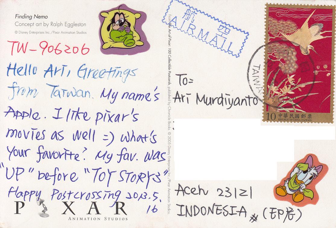 Rasanya senang dong saya dapet kartu pos Finding Nemo dari sesama penyuka film animasi Pixar. Nama pengirimnya Apple. Karena tema Pameran Kartu Pos #4 di Komunitas Postcrossing Indonesia bertema Ilustrasi, Kartun, Komik, Anime, saya pamerin kartu pos ini deh..