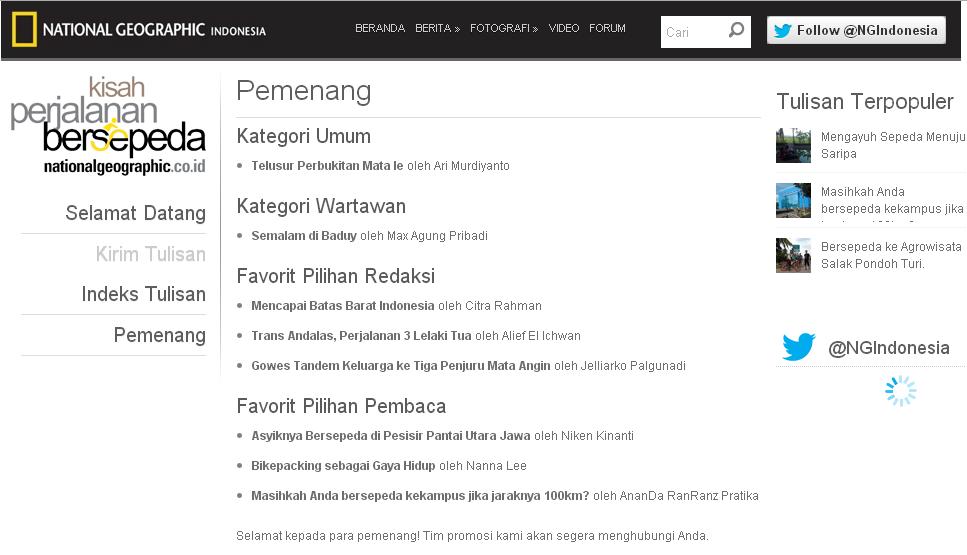Nama saya muncul sebagai pemenang Kategori Umum! Senang dong saya. Kantuk yang tadinya menerpa mendadak hilang. Dari dulu saya memang penggemar National Geographic. Dari mulai channel di televisi, majalah (saya sudah jalan 2 tahun berlangganan), sampai beberapa tas kecil berlogo kotak berwarna kuning itu saya punya. Maka begitu menjadi pemenang kontes menulis Kisah Perjalanan Bersepeda dari National Geographic Indonesia terasa sangat berarti bagi saya.
