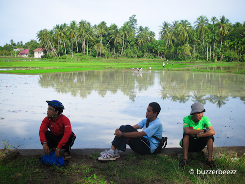 Saat kaki terasa lelah mengayuh, kami pun berhenti sejenak di pinggir pematang sawah sambil mengunyah buah pisang, bekal kami. Bekal buah pisang memang sering kami bawa ketika bersepeda yang membutuhkan waktu tempuh berjam-jam. Dengan kandungan kalium dan potasium yang membantu sirkulasi tubuh serta kandungan gula yang mudah dicerna tubuh sebagai sumber tenaga, saya rasa buah pisang adalah bekal yang cocok untuk kami. Terbukti, rasa lelah pun sirna dengan cepat karena buah pisang.