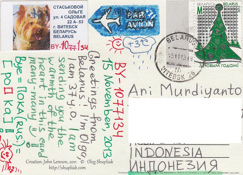 I was surprised when I got this card from Olga in Belarus. It’s definitely become my favorite right away. I love John Lennon’s songs. For me, Imagine is the most favorite of all his songs. When I look at this card, all I can think is IMAGINE. Part of the lyric of the song say “Imagine all the people Living life in peace..”. It is still an imagination of us. Still, not all the people in the world living in peace. Even after 42 years since the song was released. Sad but true.