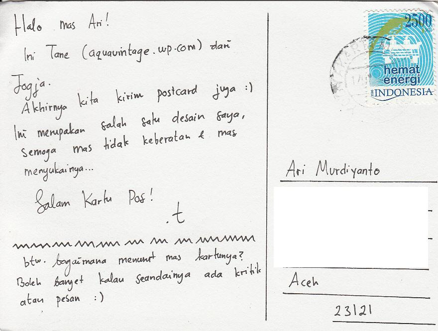 Makasih Tane sudah mengirim kartu pos keren ini. It’s definitely one of the coolest card I ever got. Ditunggu aja ya kartu balasan dari saya 🙂