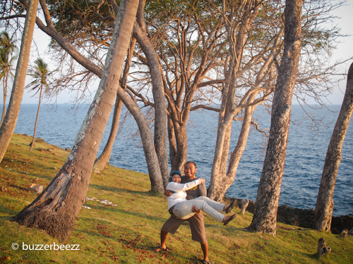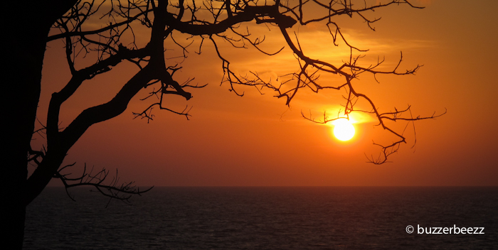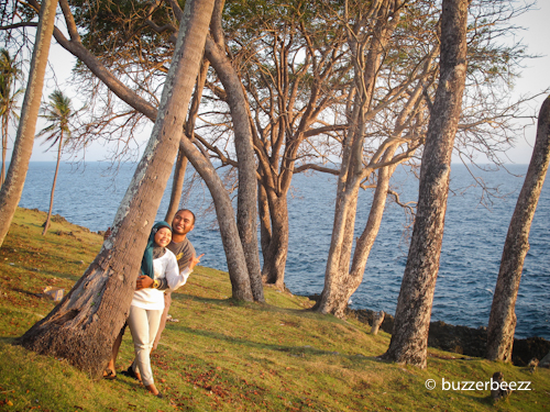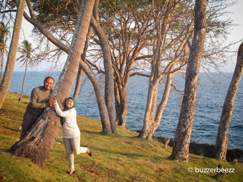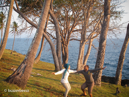 Bisa dibilang saat itu adalah pertama kalinya kami berdua menyimak sunrise setelah menjadi pasangan suami istri. Pagi yang sangat damai. Memandangi mentari yang naik perlahan, sesekali diselingi suara deburan ombak di kejauhan, nyiur melambai di hadapan kami, dan duduk bersanding bersama pasangan, ahhh.. dunia terasa milik berdua. Yang lainnya ngontrak dan nge-kos deh 😀